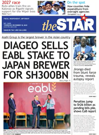 アサヒGHDによるディアジオ保有株取得を伝えるケニアのニュース番組や新聞。現地ではトップニュースとして報じられた。アサヒの買収というより「ディアジオの撤退」という文脈で報じるものが多かった
