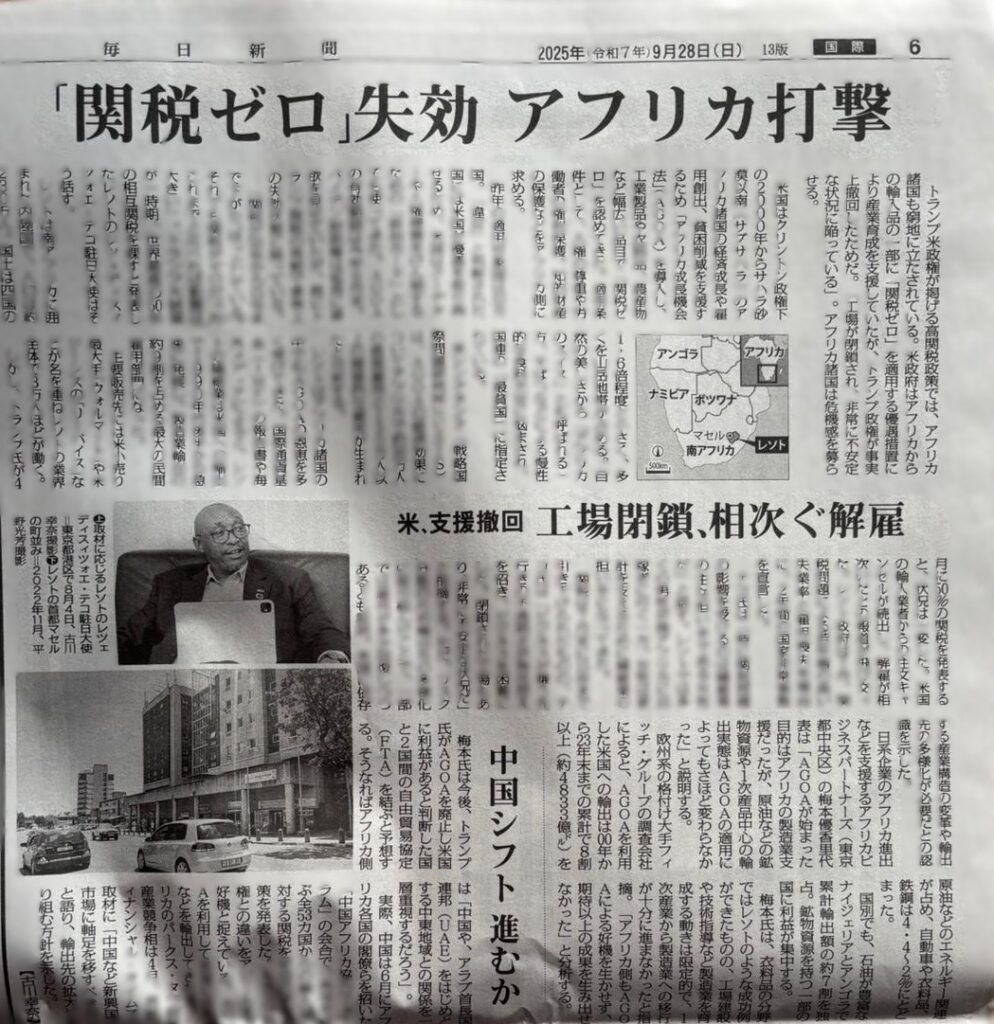毎日新聞から、アフリカと米国の間の特恵関税制度であるAGOA(アフリカ成長機会法)の9月末の失効に関して、取材を受けました。9月18日付の「トランプ政権がやめた「アフリカの関税ゼロ」 空白埋めるのは中国か」というオンライン記事および9月28日付朝刊「『関税ゼロ』失効、アフリカ打撃」において、AGOAの当初の目的、これまでの経緯、失効後の見込みについて、弊社コメントが掲載されています。